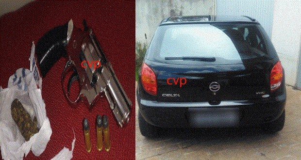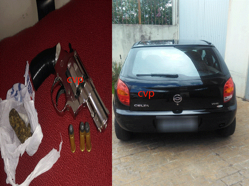 Segundo informações, o cabo Francisco e Cesar se depararam com um Celta da cor preta, placas de São Carlos ,o qual estava pela Av. Getúlio Vargas, no volante um sujeito conhecido nos meios policias. Foi dado ordem de parada, mas P.C.D.S, idade não informada, não obedeceu, adentrou a um estacionamento da loja, desceu do carro e tentou se esconder. Na fuga ele dispensou um revólver municiado. O mesmo foi detido e no seu carro, inda de acordo com a PM, foi localizada uma porção de maconha.