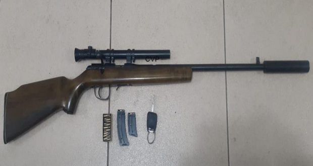 No interior do   carro  foi localizado uma  espingarda  calibre 22 e 47 cartuchos intactos. Ao ser indagado, o detido disse que havia comprado o armamento em São Paulo, porém não apresentou documentação.