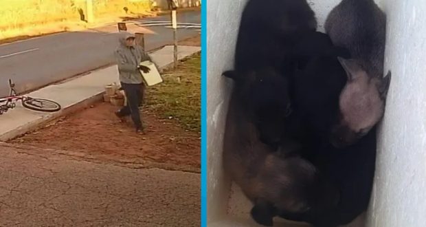 Uma imagem de câmera de monitoramento, divulgada nas redes sociais, mostra quando homem deita a bicicleta no chão e caminha com os filhotes dentro da caixa.