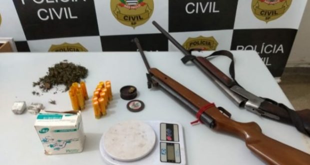 Após Investigações realizadas pelo Setor de Investigações da Delegacia local, visando o combate ao crime contra o patrimônio praticado principalmente na área rural do município, Policiais Civis de Ribeirão Bonito, com apoio do GOE de São Carlos e de Policiais Militares cumpriram Mandados de busca domiciliar em 3 propriedades rurais, sendo abordadas 10 pessoas; que em uma das propriedades foram localizadas uma espingarda cartucheira .20, com munições intactas e deflagradas, uma espingarda de pressão, 65 gramas de maconha e uma balança; um homem foi preso em flagrante delito por posse ilegal de arma de fogo.