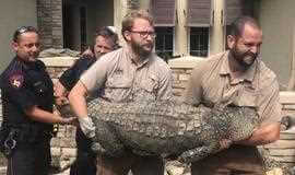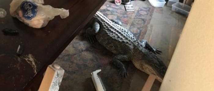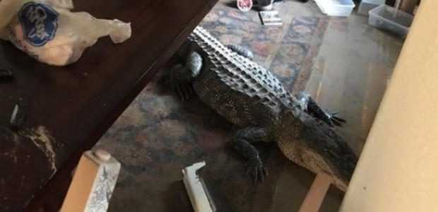 Sim, um aligátor (típico jacaré americano) estava “morando” na residência. O animal media 2,7 metros.