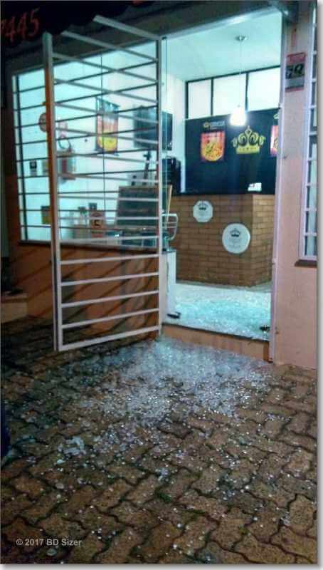 Segundo boletim de ocorrência, a PM foi acionada para o local, pois moradores do prédio estavam vendo um indivíduo arrombando a pizzaria que fica no térreo. Quando os cabo Tercio  e soldado Alex  chegaram ao local a porta de  vidro e a grade haviam sido arrombados e havia sangue no chão.  O ladrão após praticar o delito deixou o local. A PM saiu em patrulhamento e encontrou o suspeito na rua  Totó Leite. Ainda de acordo com boletim de ocorrência, ele carregava uma caixa. O suspeito  foi detido e reconhecido pelas testemunhas como sendo o homem que havia praticado o delito. A vítima foi localizada e reconheceu a caixa como sendo de seu estabelecimento. O sujeito foi encaminhado ao Plantão Policial, autuado em flagrante por furto qualificado e recolhido ao Centro de Triagem de São Carlos.