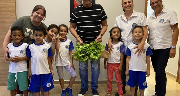 Durante o encontro, eles entregaram ao chefe do Poder Executivo, pés de alface, que cultivaram na escola.