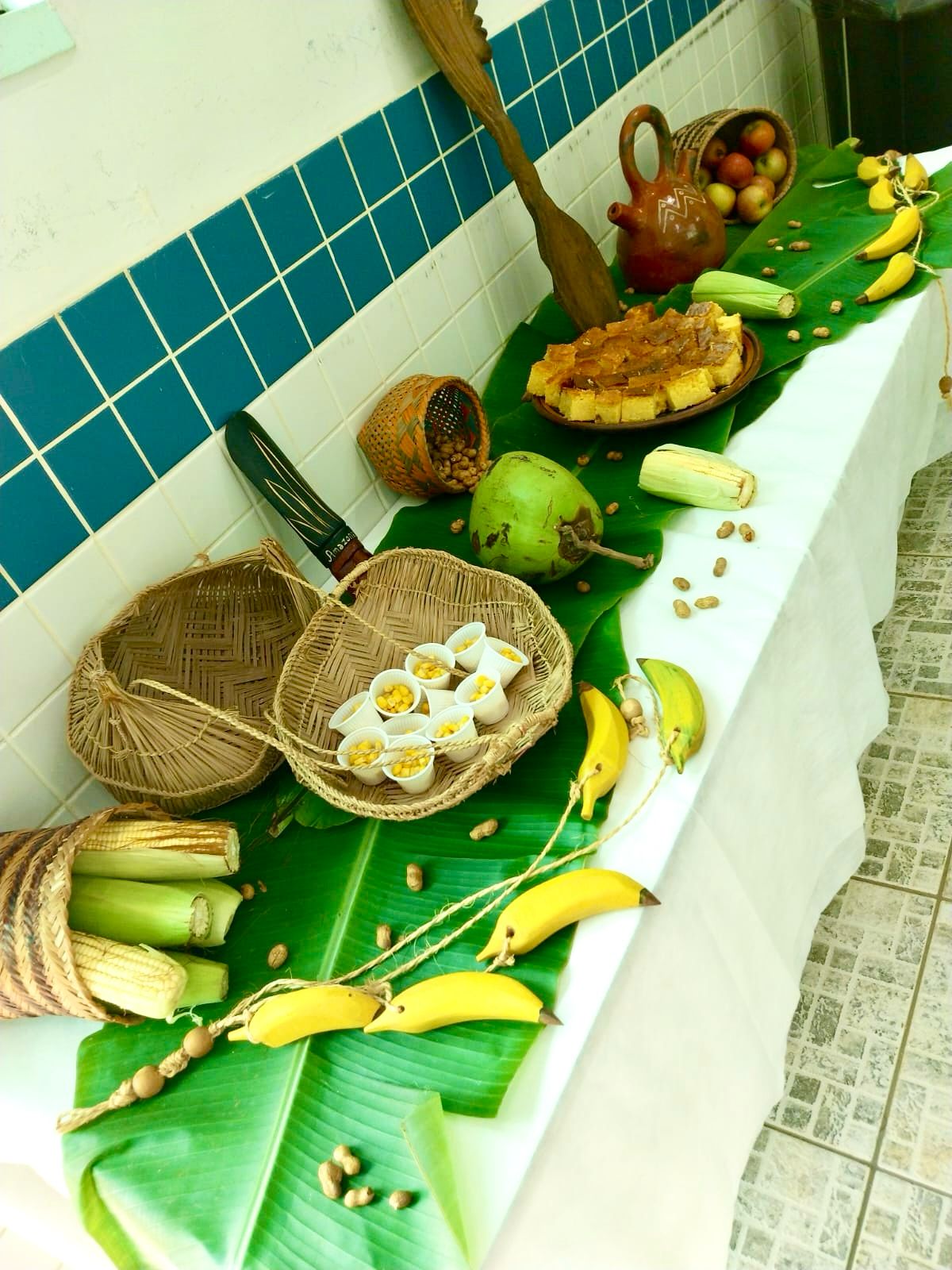 Durante as atividades, os alunos participaram das ações que incluíram uma mesa coletiva provida de alimentos oriundos da culinária indígena.