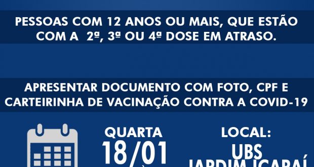 A imunização contra a Covid-19 é direcionada às pessoas com 12 anos ou mais, que estão em atraso com a 2ª, 3ª ou 4ª dose da vacina. “O objetivo dos plantões noturnos é atender a população que não consegue se vacinar durante o dia”, explica a secretária municipal de Saúde, Elaine Sartorelli Breanza, que ressalta os horários de vacinação de segunda a sexta-feira, diuturnamente. “Para se imunizar durante o dia, basta procurar a UBS ou PSF mais próximo do seu bairro, de segunda a sexta-feira, das 8h30 às 11h30 e das 13h00 às 15h00”, lembrou.