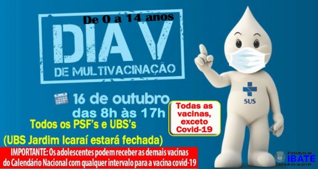 A Secretaria Municipal da Saúde de Ibaté, por meio da Vigilância Epidemiológica, realiza neste sábado, dia 16 de outubro o “Dia V” da Campanha de Multivacinação 2021.