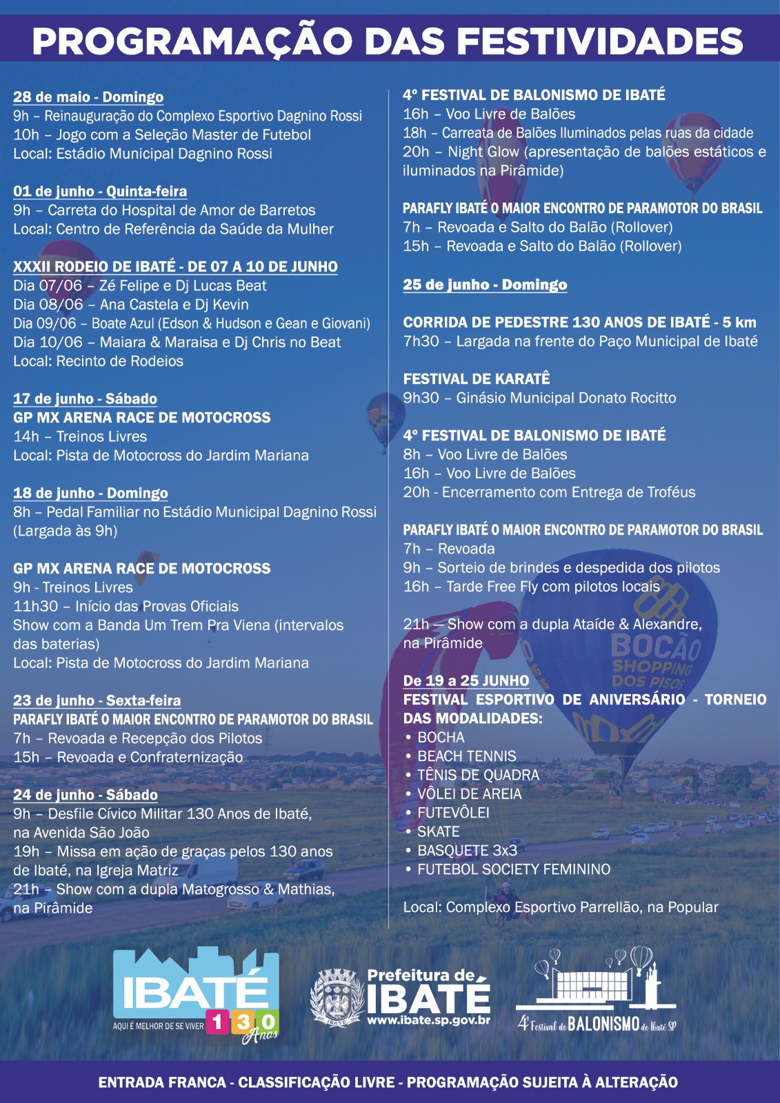 As Festividades seguem até o dia 25 de junho. A programação completa pode ser acessada pelo site www.ibate.sp.gov.br.
