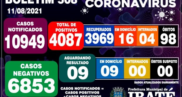 De acordo com o boletim diário de hoje, Ibaté registra 4.087 casos positivos (sendo 3.969 recuperados; 16 casos em isolamento domiciliar; 04 pacientes em internação e 98 óbitos); 6.853 resultados de exames negativos; 09 pacientes aguardando resultados (todos em isolamento domiciliar).