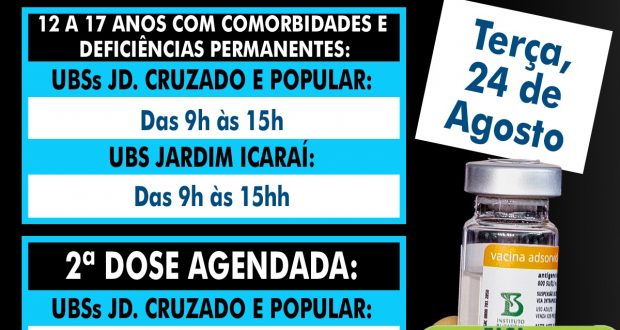 A Secretaria Municipal da Saúde de Ibaté realiza nesta terça-feira, 24 de agosto, a aplicação da primeira dose da vacina contra COVID-19 em adolescentes com comorbidades e deficiências permanentes, que tenham 12 anos de idade [ou mais], além de grávidas e puérperas da mesma faixa etária.