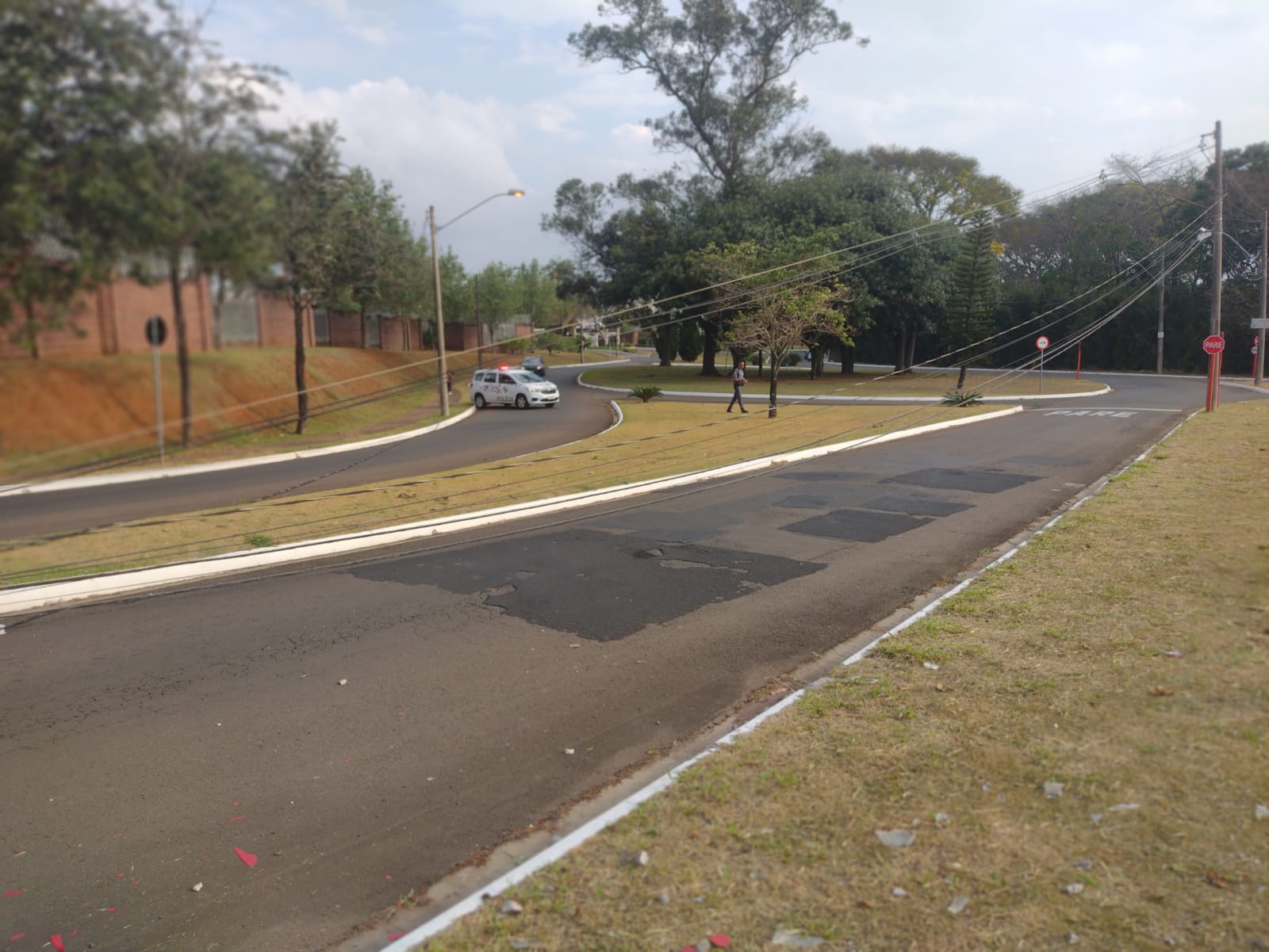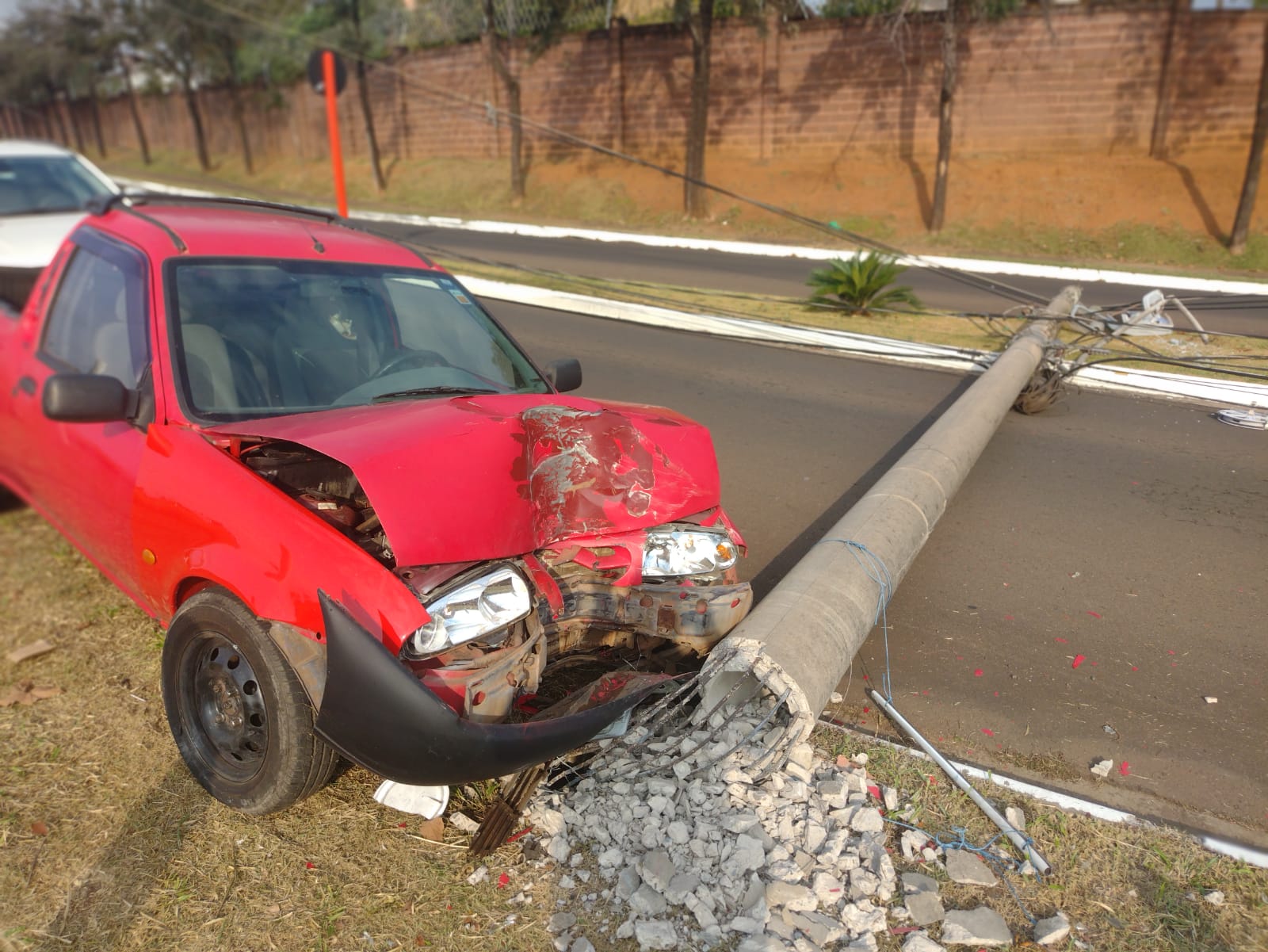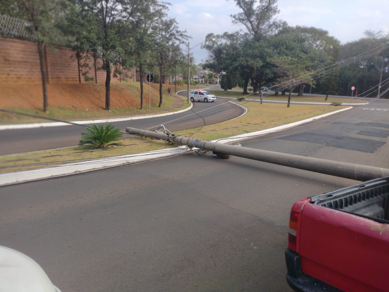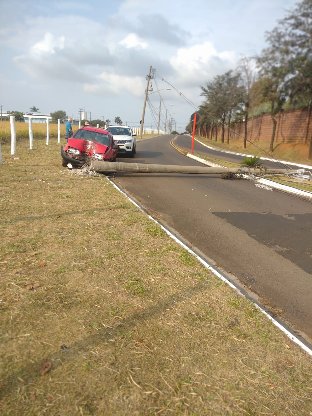Um poste foi ao solo nesta tarde de terça-feira, 29 de agosto de 2023, após ser atingido por um carro na Rua  Maria de Cresci Leopoldino, bairro  Montreal, São Carlos-SP.