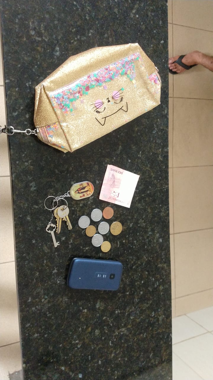 Via 190 o caso foi comunicado ao copom, sendo empenhada a equipe de apoio ao policiamento, cabos Caetano e Garcia, que com o apoio do Comando de Força Patrulha, 1 Tenente Elizabete e cabo Miguel, conseguiram apreender o menor, recuperar os objetos de pertence da vítima, porém, uma quantia em dinheiro que estaria na bolsa não foi localizada.