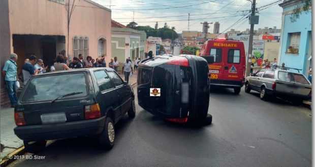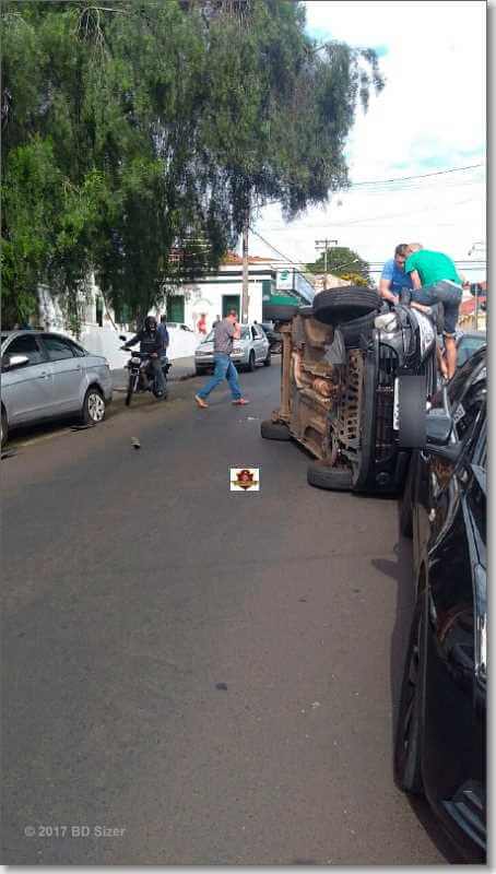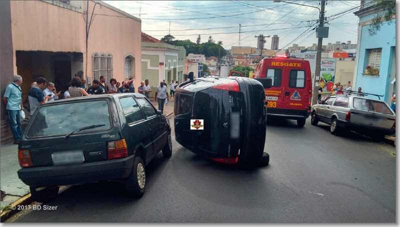 Um senhor de 87 anos tombou seu carro nesta manhã de segunda-feira, 9 de outubro de 2017, na rua José Bonifácio, cruzamento com a rua Santa Cruz, Centro dde São Carlos-SP.