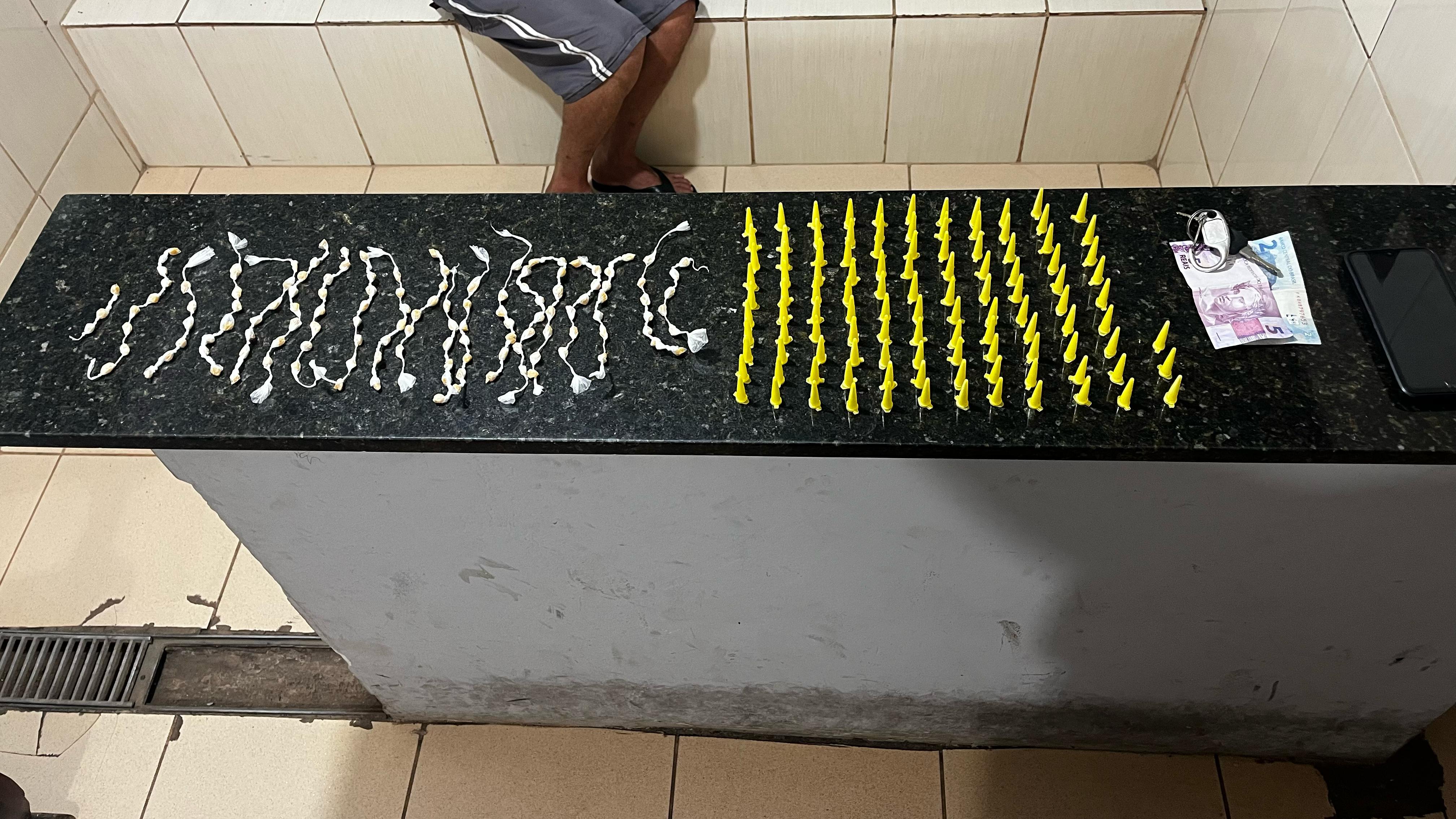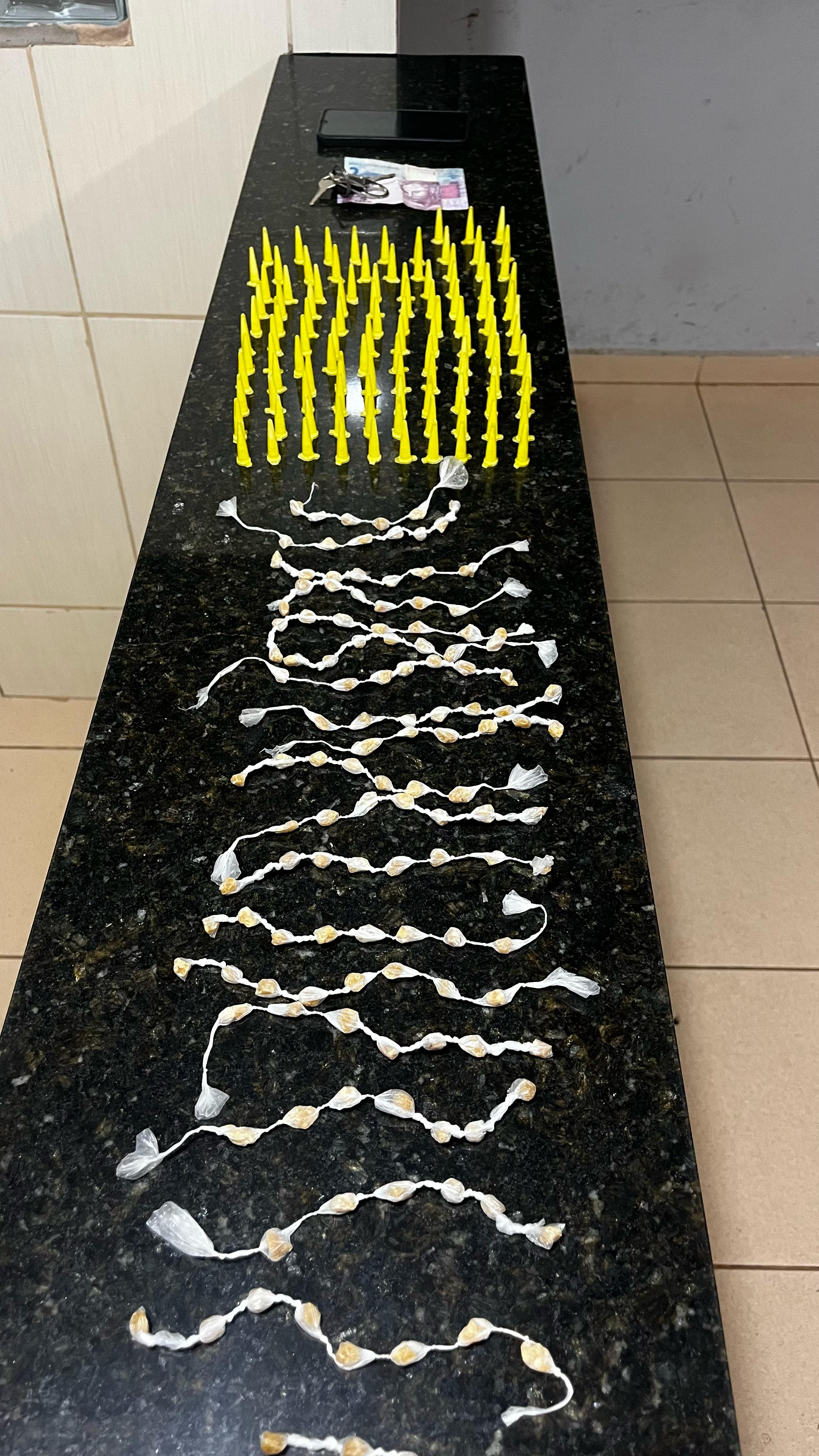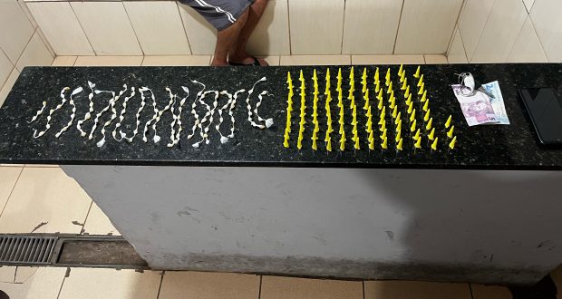 De acordo com informações, uma equipe da DEJEM, composta pelo tenente Perroni e soldado Barros, estava em patrulhamento preventivo, quando avistou um veículo Gol transitando em alta velocidade. Os policiais foram no encalço e abordaram o veículo. Em revista pessoal, foram localizados 112 pinos de cocaína e 130 pedras de crack dentro da cueca do abordado. M.R.C, de 32 anos, foi encaminhado para a Central de Polícia Judiciária, onde ficou à disposição da justiça.