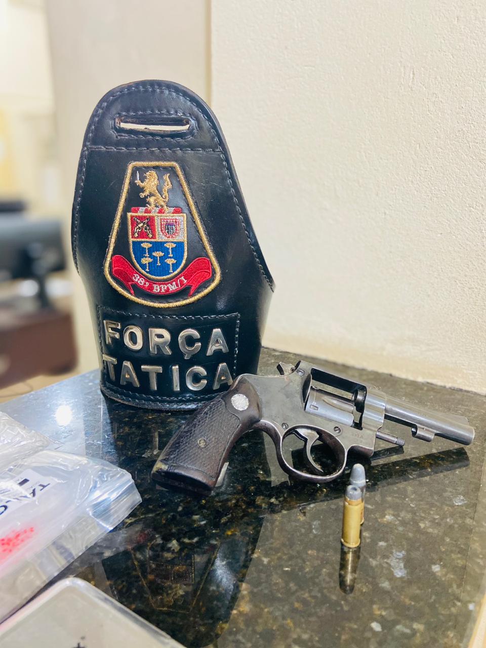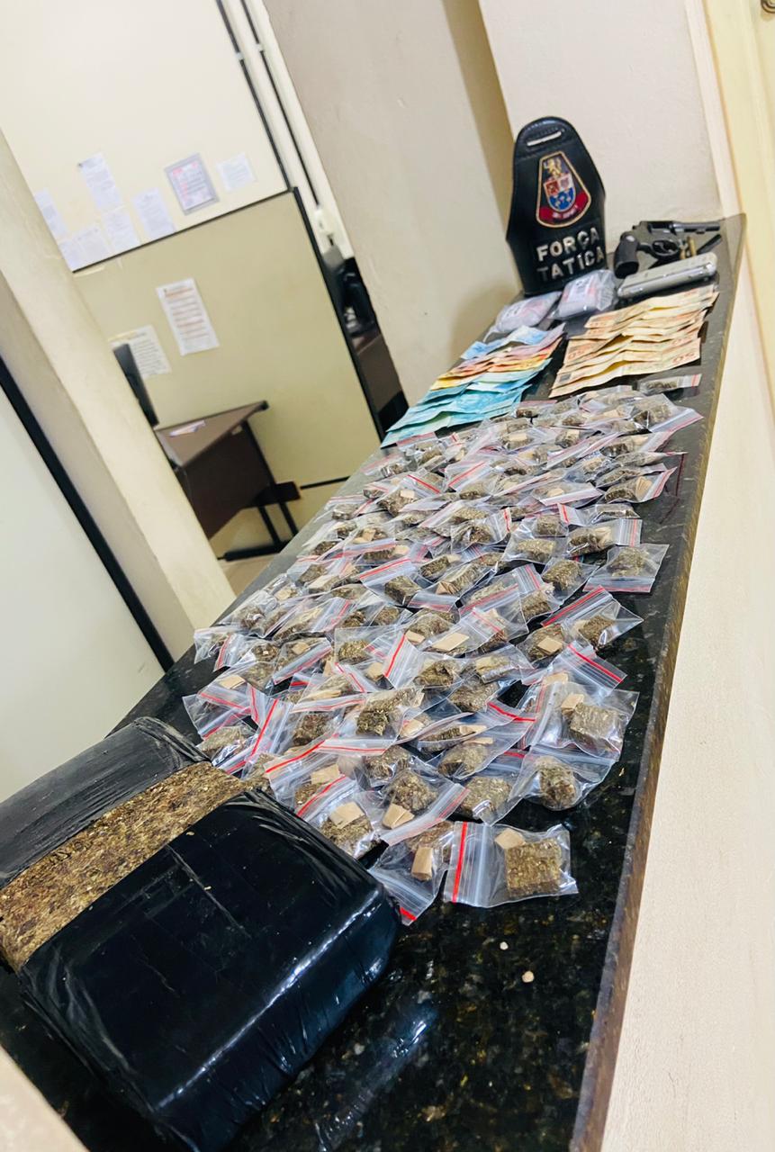Durante a vistoria no imóvel foi localizado um revólver calibre 32 municiado, 128 porções de maconha, 01 tijolo de maconha e material para embalagem.
