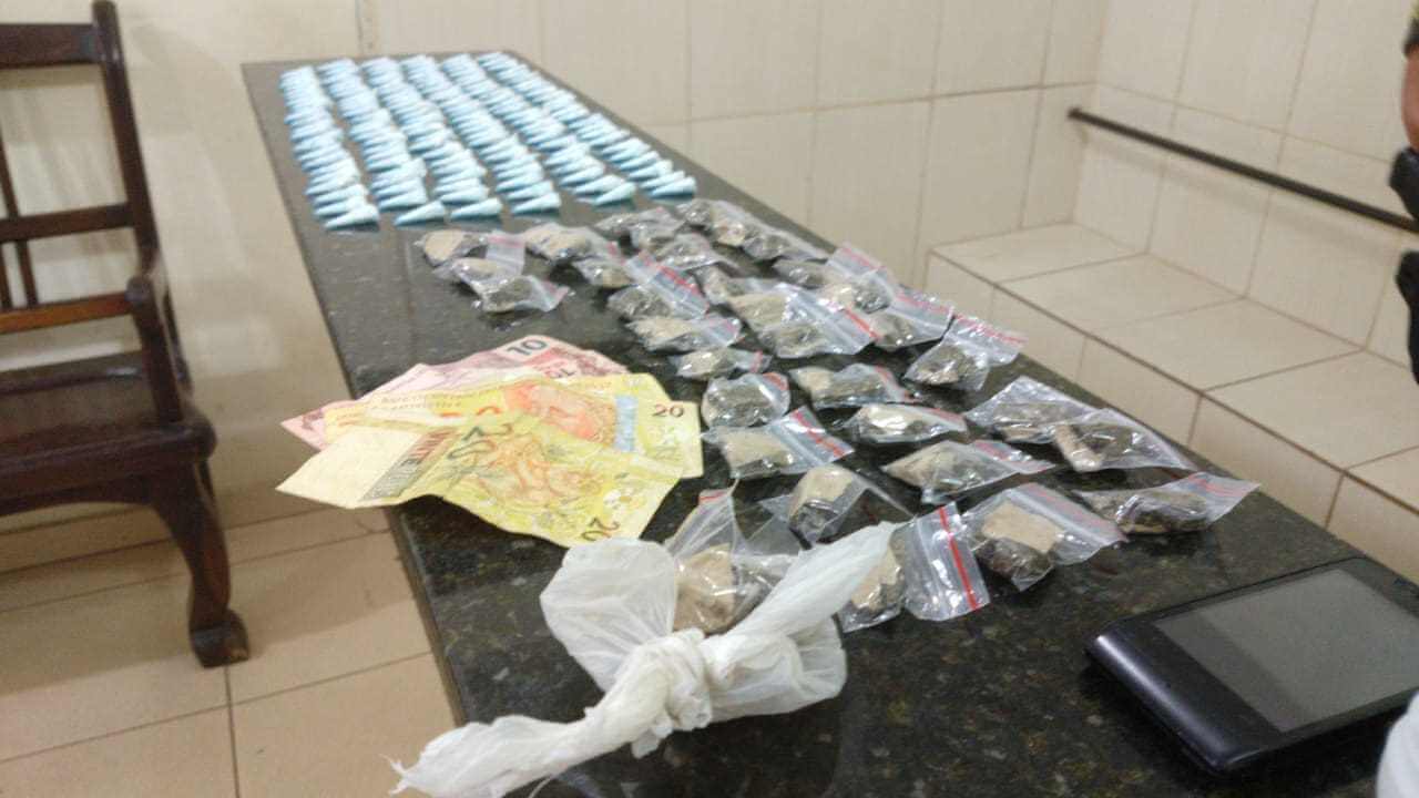 Segundo informações, os policiais abordaram o suspeito e em seu poder e também nas proximidades foram localizadas drogas. Ele foi encaminhado ao Plantão Policial onde está sendo aguardando o desfecho da ocorrência.