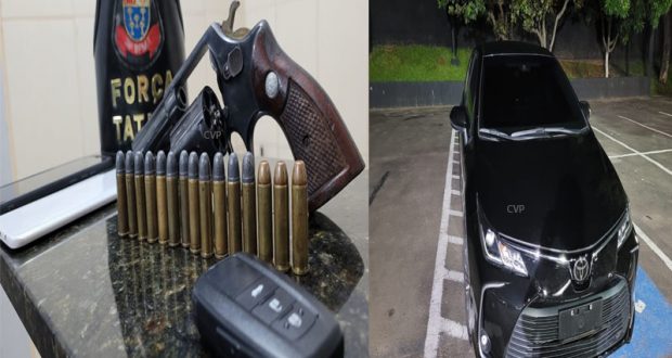 Segundo informações, as viaturas da Força Tática estavam em patrulhamento pela região do Ginásio Milton Olaio Filho, quando uma equipe avistou um veículo Corolla da cor preta,  no contra fluxo. Os policiais verificaram que a placa que o mesmo ostentava, era de um veículo Corolla da cor branca. O cerco foi fechado e uma viatura composta pelo sub tenente Douglas, cabos Neto e Cesar localizou o veículo no estacionamento do Ginásio Milton Olaio Filho. G.I.S, de 23 anos, condutor do veículo foi detido. Os policiais constataram que o carro havia sido roubado em Jau. Um revólver calibre 38, municiado com 06 cartuchos íntegros e 09 munições do mesmo calibre sobressalentes, foi apreendido. O meliante foi encaminhado para a Central de Polícia Judiciária, autuado em flagrante pelo delegado, Dr. Rubens Venâncio Feitosa e recolhido ao Centro de Triagem. O carro foi recolhido ao pátio e a arma apreendida.