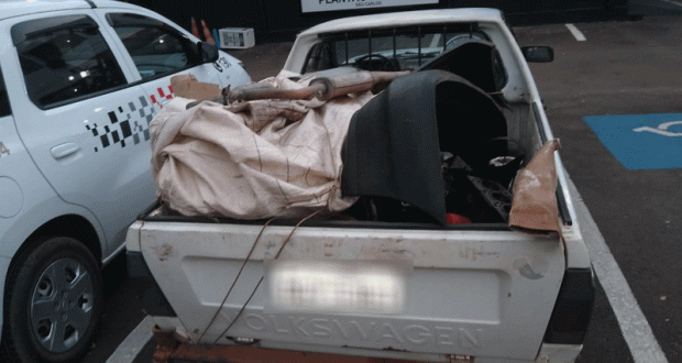 Na carroceria do veículo abandonado foram localizados motores de carros, câmbios e escapamentos. Um dos motores estava com queixa de furto. A ocorrência foi encaminhada ao Plantão Policial, onde foi registrado boletim de ocorrência e o veículo recolhido ao Pátio.