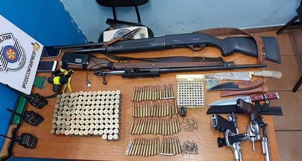 Nas caminhonetes, os policiais encontraram várias munições, revólveres, uma espingarda, um fuzil, facas, carregadores, rádios comunicadores, mira laser e mira telescópica.