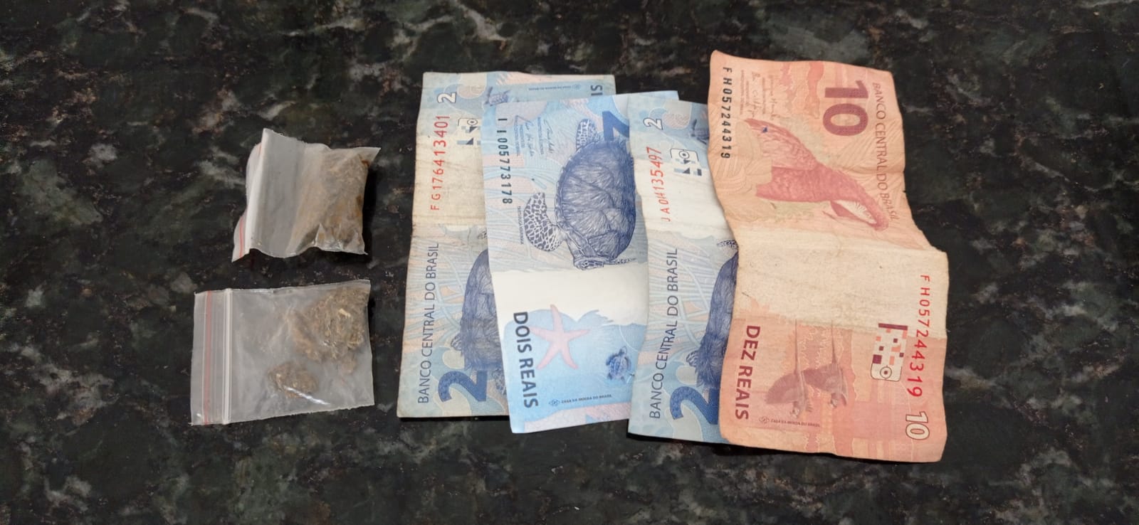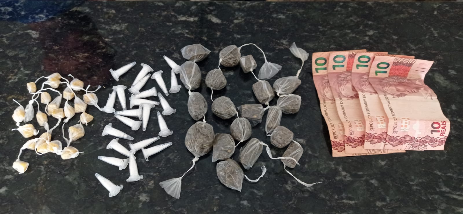 Segundo informações, os policiais estavam em patrulhamento, quando depararam-se com dois indivíduos. Devido o local ser conhecido como biqueira de drogas, a equipe realizou a abordagem. Em revista pessoal, foram localizados com o menor R$ 40,00, 19 invólucros de maconha, 22 pinos de cocaína e 22 presas de crack. Com o maior foram localizados no bolso de sua bermuda 02 invólucros de maconha e R$ 16,00. O menor confessou que estava vendendo drogas e o maior disse ser usuário. Ambos foram conduzidos para a Delegacia da Polícia Civil e liberados.