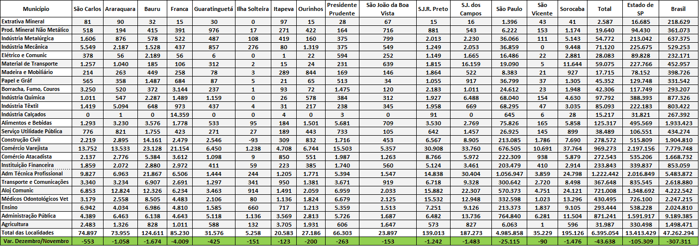 Interior Paulista e São Carlos. Para uma visão geral da atividade econômica no interior e em São Carlos, selecionamos um conjunto de cidades que estão na fronteira do Estado e na região central. O objetivo é ilustrar movimentos do emprego formal (com carteira de trabalho) no mês de dezembro do ano passado. Os dados dentro da Tabela registram o emprego com carteira em subsetores selecionados. A última linha da Tabela 1, em destaque, registra a variação do número de emprego formal com relação ao mês de novembro de 2019.