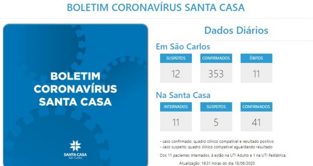 A Santa Casa informa nesta quinta-feira (18/06) que o número de casos confirmados (são pacientes para quem o resultado de exames deu positivo e que receberam tratamento na Santa Casa do início da pandemia até agora) subiu para 41. O resultado de exame de uma mulher, 83 anos, de São Carlos, que havia falecido ontem, 17/6, deu positivo hoje. Os resultados de exames de 2 pacientes que receberam alta (1 mulher, 84 anos, de outro município, e 1 homem, 45 anos, de São Carlos, internado desde 2/6) também deram positivo. E 1 homem, 64 anos, de São Carlos, internado desde 15/6 na UTI Adulto, também foi diagnosticado com COVID-19.