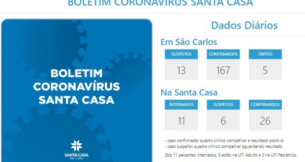 Até agora, depois do resultado exames por laboratório credenciado, a Santa Casa registra 26 casos confirmados. Como citado acima, 2 pacientes diagnosticados com COVID-19 estão na UTI Adulto. Uma mulher, 60 anos, internada desde o dia 27/5 em leito de enfermaria recebeu alta hoje. Com ela, 18 pacientes receberam alta. 2 pacientes também foram transferidos. Além de 4 óbitos por COVID-19.