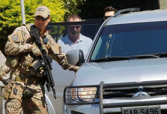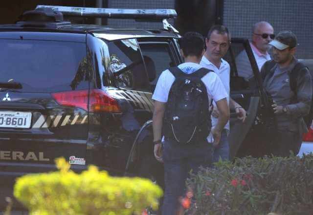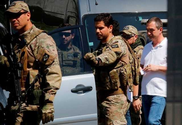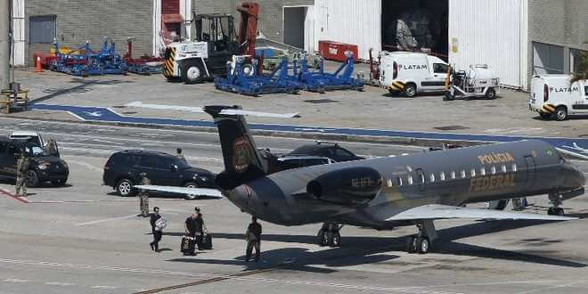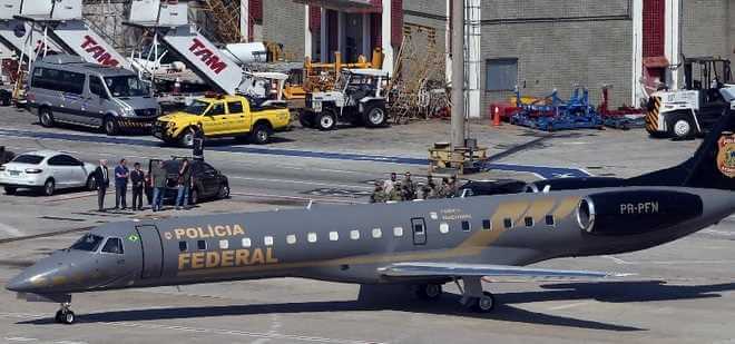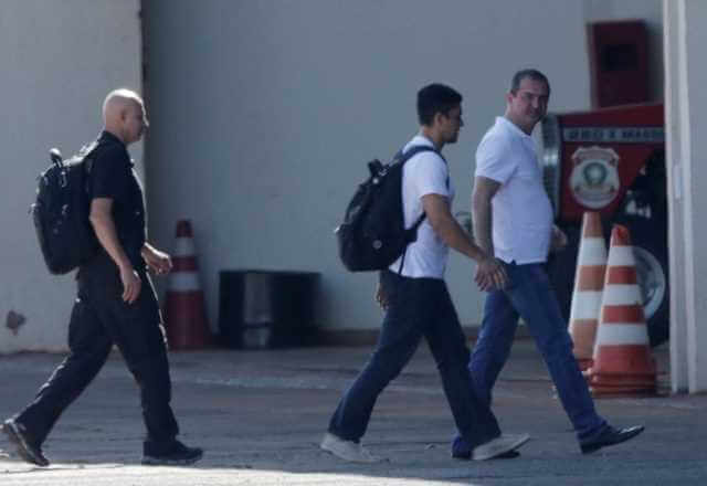 Escoltado por policiais fortemente armados, os empresários foram conduzidos até o aeroporto. Imagem mostra os preparativos para o transporte da dupla, presa temporariamente no domingo (10). Os dois presos partiram para Brasília onde permanecerão em poder da PF até que a justiça determine o destino dos mesmos.