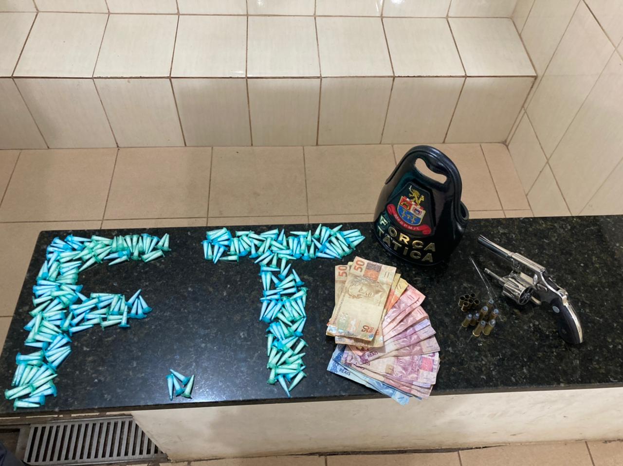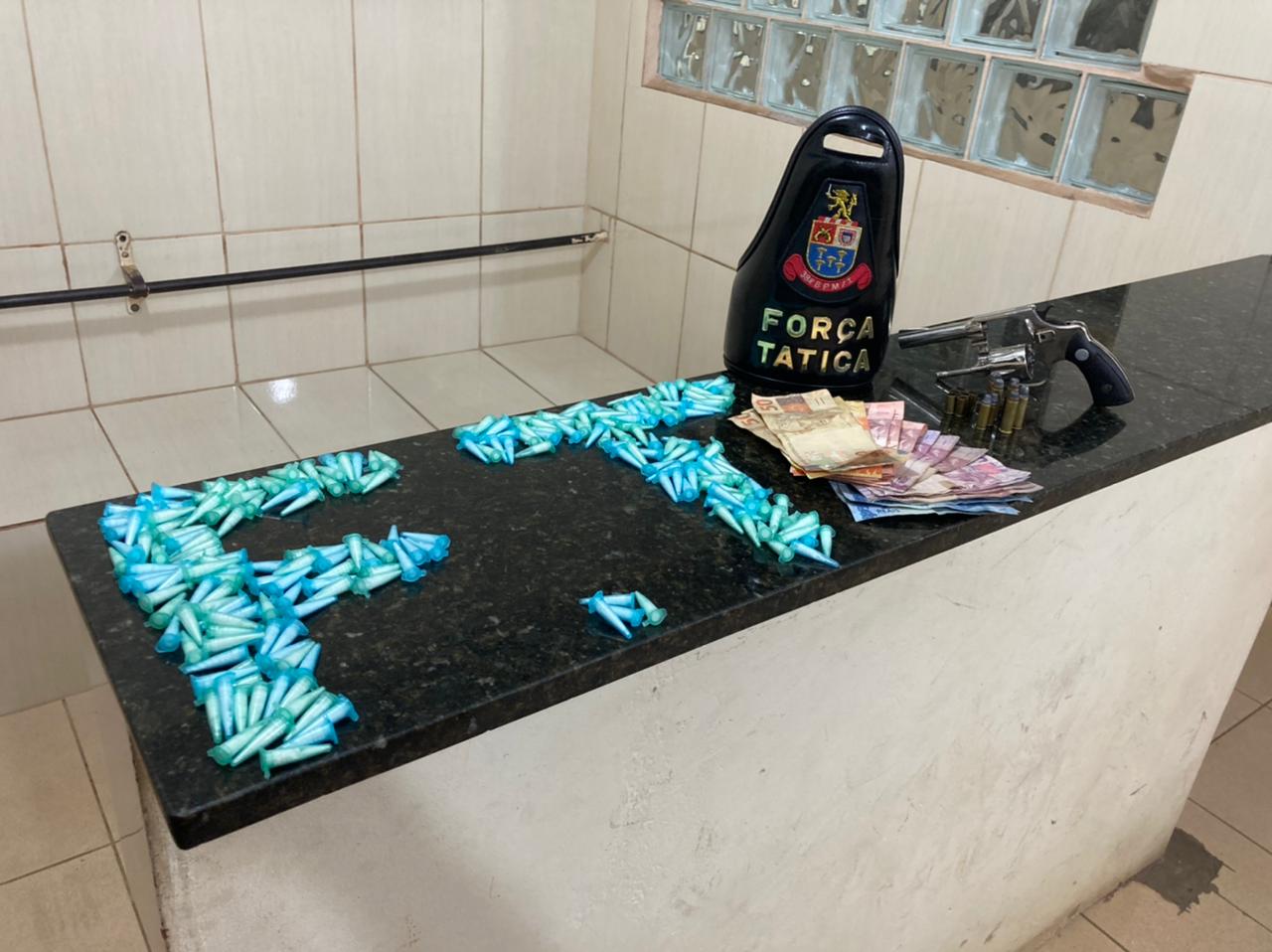 Í. E. S.A, de 20 anos, foi detido por policiais militares da Força Tática nesta noite de domingo, 07/02/2021, com drogas, dinheiro e uma arma de fogo na Rua José Giro,bairro Cruzado, Ibaté-SP.