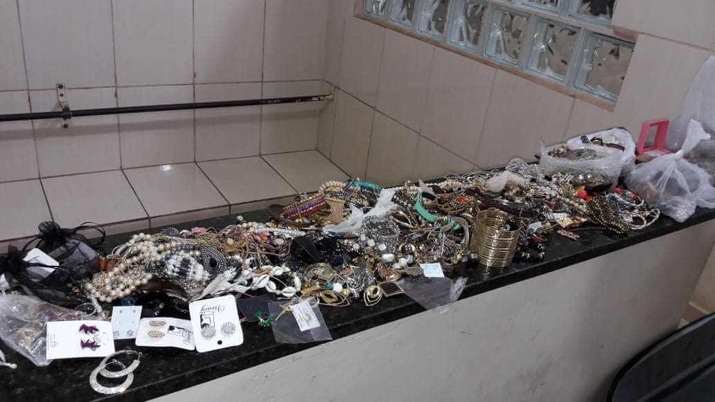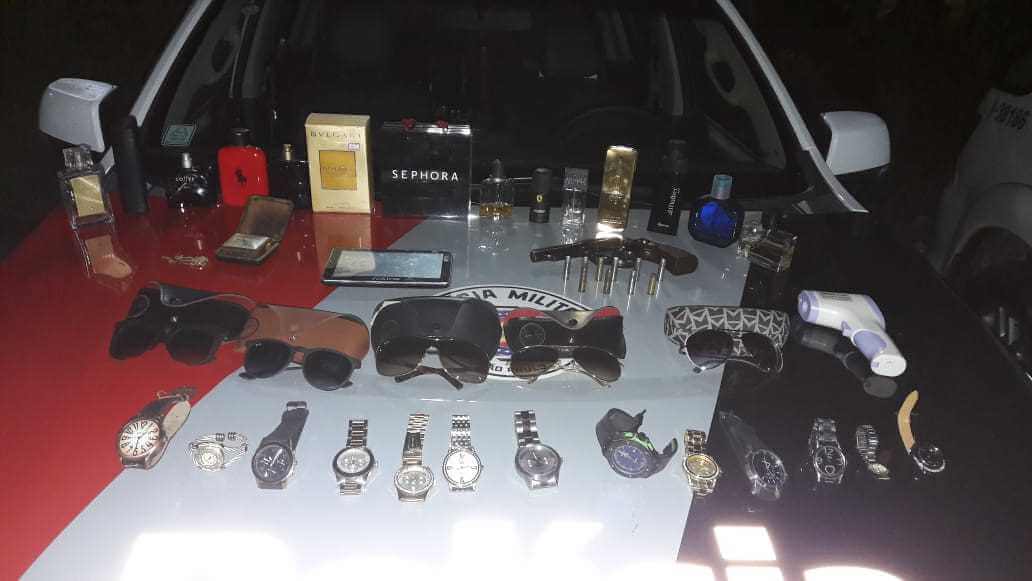 Equipes da PM foram para o local e detiveram C. A. G. J. e em sua casa foram localizados varias bijuterias, óculos de sol de varias marcas, assim como perfumes e relógios, foi localizado também um revolver, marca Taurus, calibre 38 e 10 munições do mesmo calibre. Ainda de acordo com a PM, o revólver estava com queixa de furto. O averiguado foi encaminhado ao Plantão Policial, onde foi autuado em flagrante e liberado após pagar fiança de R$ 3.000,00.