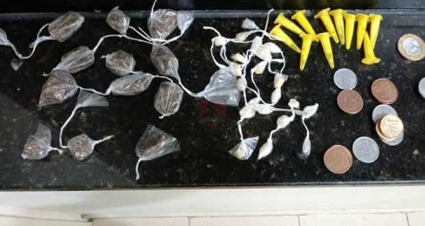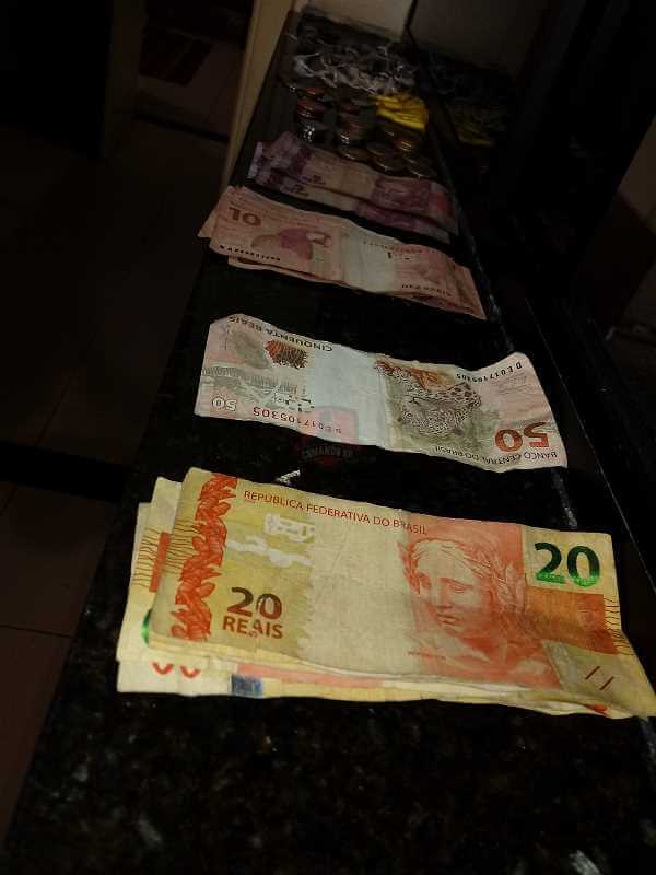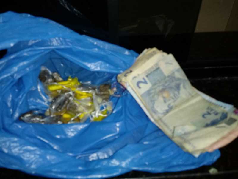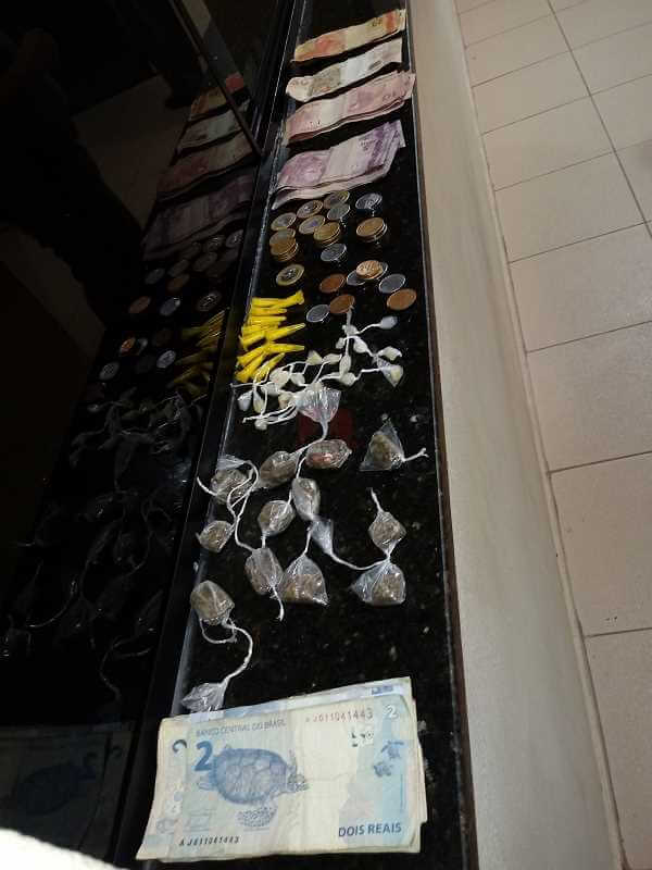 No total foram apreendidos R$ 369,085 (trezentos e sessenta e nove reais e oitenta e cinco centavos ), 12 pinos cocaína, 18 pedras crack e 12 porções de maconha.