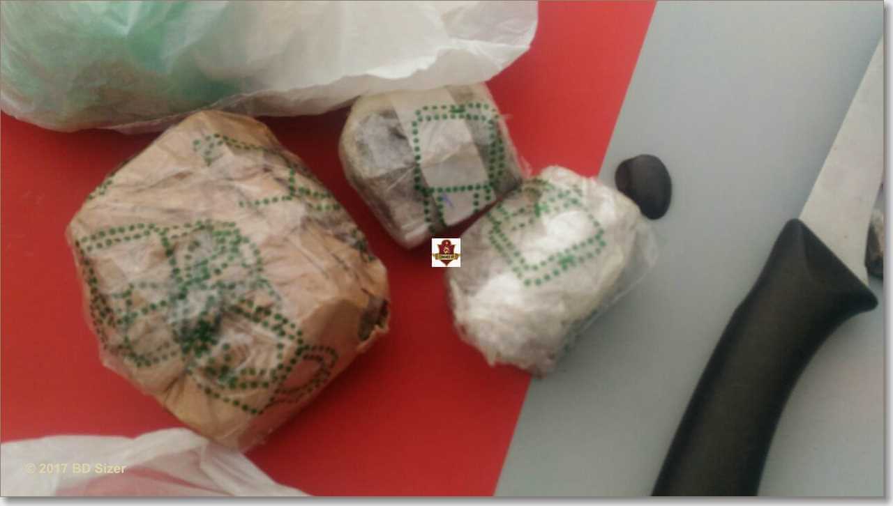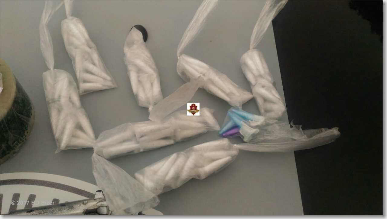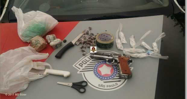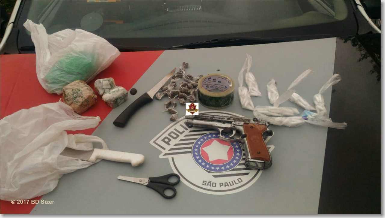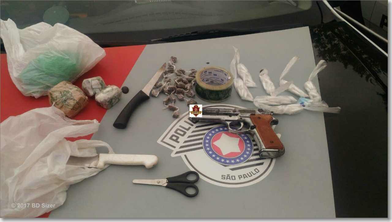 Ainda de acordo com a PM, na casa foi localizada uma réplica de arma fogo (pistola), 100 pinos de cocaína, 30 trouxas de maconha prontas para a venda, 04 porções maior maconha (bruta), 40 pinos vazios, 02 facas e 01 tesoura.