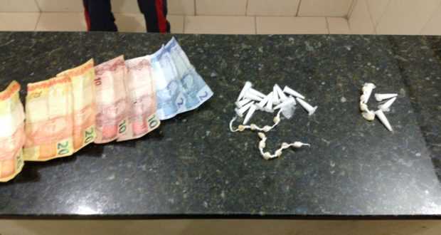 Segundo informações, policiais militares estavam em patrulhamento preventivo quando se depararam com Adilson Carneiro da Silva, o qual foi abordado e segundo os policiais, cabo Luciano e soldado Garcia, com o mesmo foram localizados drogas. R$ 82,00 reais, 14 pedras e 17 pinos foram apreendidos. O jovem foi encaminhado ao Plantão Policial, ficando à disposição da justiça.