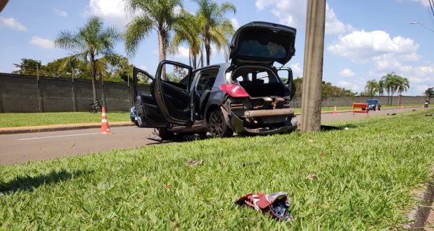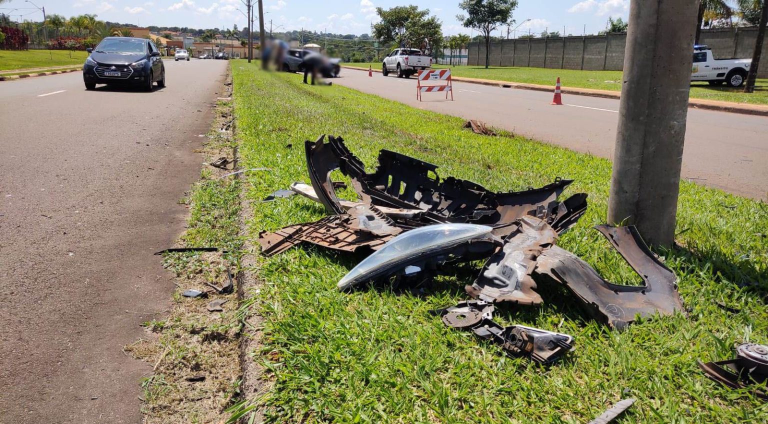 O carro subiu no canteiro central e atingiu o primeiro poste, parando somente depois de atingir o segundo. A dianteira do carro ficou completamente destruída.
