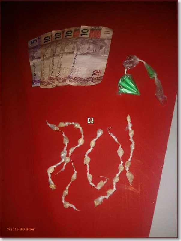 Segundo informações, policiais do Rádio Patrulhamento, De Oliveira e R.Frisene, patrulhavam pela referida rua, ao perceber a viatura policial o averiguado J. R. G. S, de 21 anos, correu para o interior da residência. Os PMs saíram no encalço e foram localizados no interior de uma caixa de energia elétrica onde o suspeito escondeu, 28 pedras crack, 06 pinos cocaína R$ 45,00 reais. O detido foi encaminhado ao Plantão Policial ficando à disposição da autoridade policial.