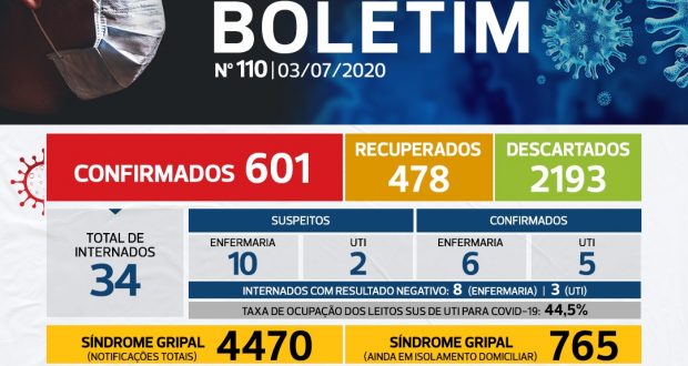 Dos 601 casos positivos, 536 pessoas apresentaram Síndrome Gripal e não foram internadas, 1 óbito sem internação, 64 pessoas precisaram de internação devido a COVID-19, 41 receberam alta hospitalar, 11 estão internados e 12 positivos internados foram a óbito. 478 pessoas já se recuperaram totalmente da doença. 2.193 casos suspeitos já foram descartados para o novo coronavírus já que 35 resultados negativos foram liberados hoje.