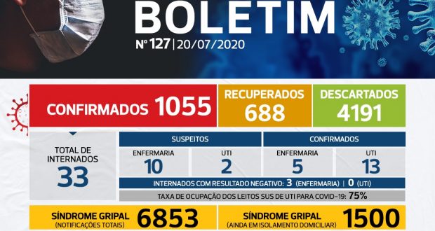 Estão internadas neste momento 33 pessoas, sendo 17 adultos na enfermaria (5 positivos, 9 suspeitos, 3 negativos); na UTI adulto hoje estão internadas 14 pessoas (13 positivos – sendo 3 de outros municípios e 1 suspeitos). Na UTI uma criança de outro município está internada com suspeita da doença. Uma criança está na enfermaria também com suspeita da doença. A taxa de ocupação dos leitos especiais para COVID-19 de UTI/SUS está hoje em 75%.