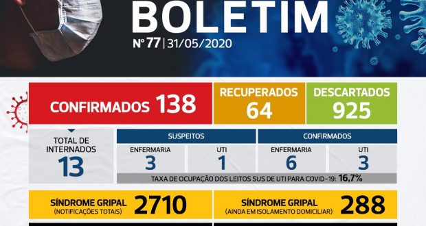 Dos 138 casos positivos, 107 apresentaram Síndrome Gripal e não foram internadas, 31 pessoas precisaram de internação devido a COVID-19, 18 receberam alta hospitalar, 8 permanecem internados e 5 positivos foram a óbito. 64 pessoas já se recuperaram totalmente da doença.