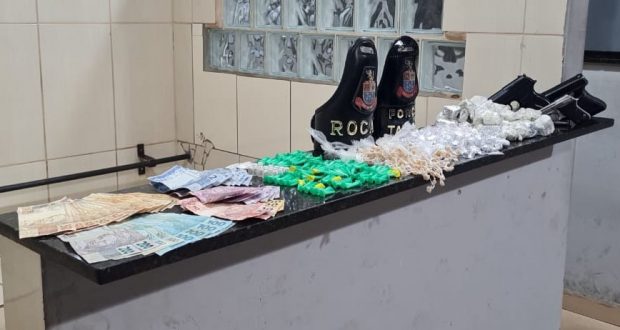 Dentro da sacola que o menor carregava, foram encontradas maconha, haxixe, crack, cocaína em porções, uma pistola 635 municiada com 7 munições e duas réplicas de arma de fogo.