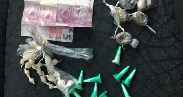 Segundo informações, os policiais, Trindade e Vedovelli abordaram o menor e com o ele foram localizadas 26 pedras de crack , 8 buchas de maconha , 14 pinos de cocaína e R$ 15,00.