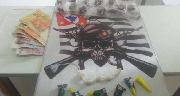 Segundo informações, os policiais sargento Humberto, cabo Borges e soldado Pascoalino estavam em patrulhamento quando avistaram o menor. Ele jogou uma sacolinha ao solo e foi abordado. 13 porções de maconha, 06 de cocaína, 5 pedras de crack e R$ 75,00.