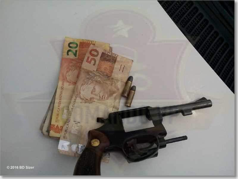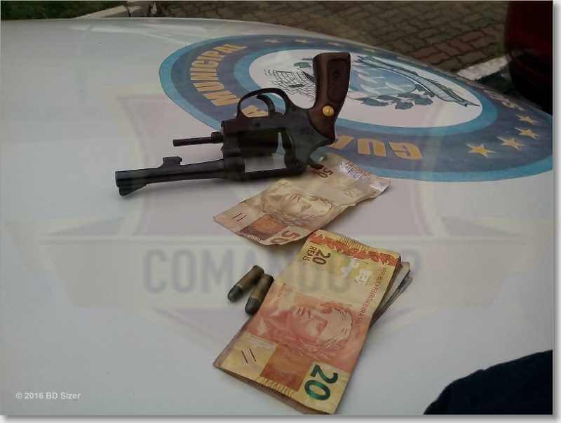 Segundo informações, três marginais em poder de arma de fogo, adentraram ao estabelecimento e praticaram o roubo. Eles fugiram e a vítima pediu apoio para uma guarnição da G.M que passava pelo local. A Guarda acabou detento o meliante, menor de idade, o qual havia escondido a arma em uma mata. Parte do dinheiro foi apreendida e a arma localizada. Um veículo Parati que seria usado na fuga foi abandonado pelos assaltantes. O menor que já tem uma ficha criminal imensa foi encaminhado ao 2º D.P, aonde ficou à disposição da autoridade.