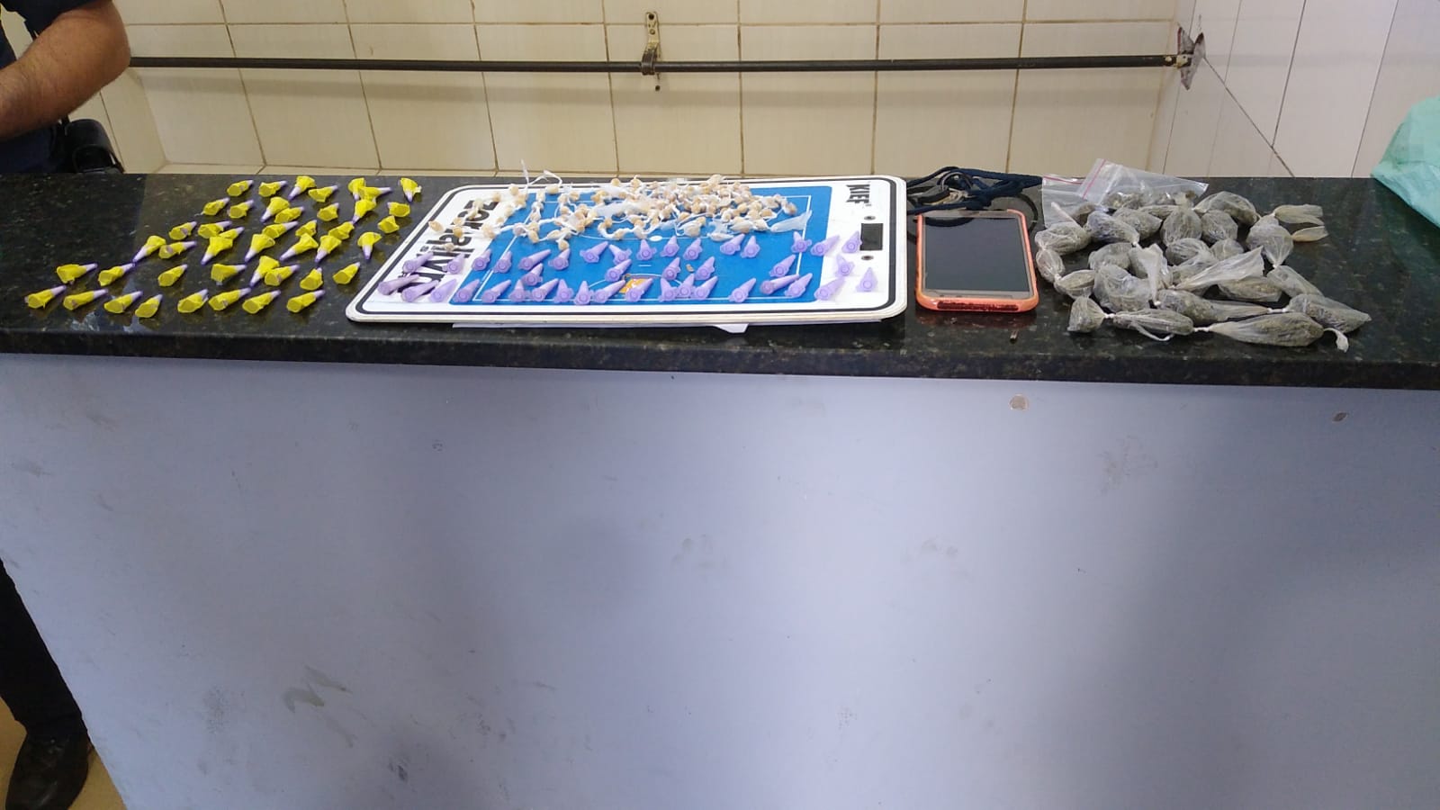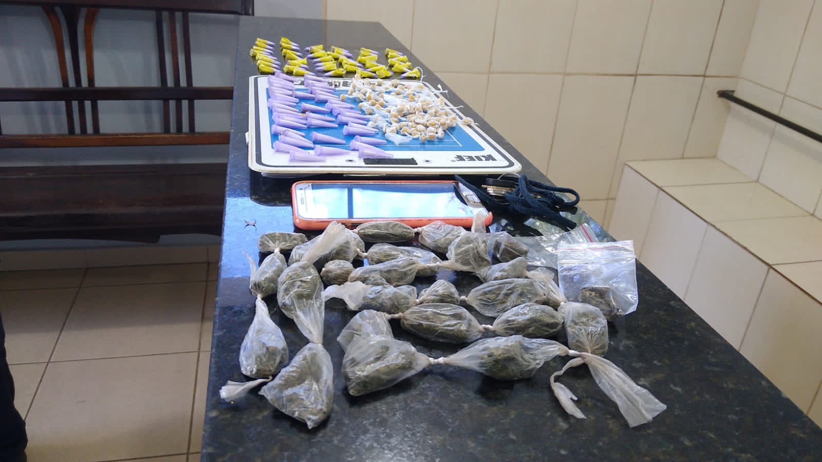 De acordo com informação, a guarnição estava patrulhando pela zona sul, quando cinco jovens estavam conversando próximo de um sofá. Quatro correram e um foi apreendido. No sofá foram apreendidos 85 pinos de cocaína, 129 pedras de crack, 26 porções de maconha e um celular. O menor foi encaminhado à Central de Polícia Judiciária e entregue para a mãe.