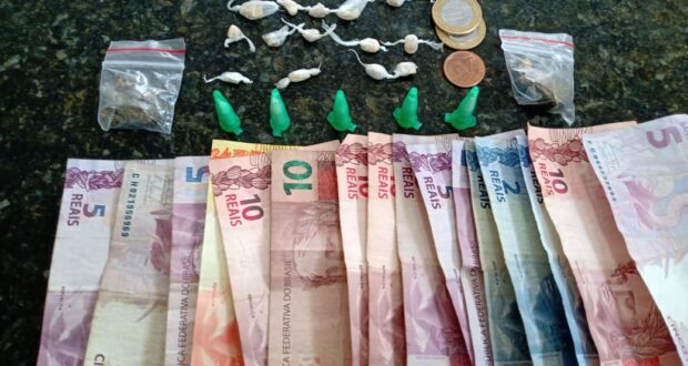 No sofá onde o autor estava mexendo, foi localizado  mais dinheiro, totalizando a quantia de R$ 117,35 e entorpecentes, sendo; (14) pedras de crack (04) porções de maconha, (05) eppendorfs de cocaína. Questionado, assumiu estar na prática de tráfico de drogas no local.