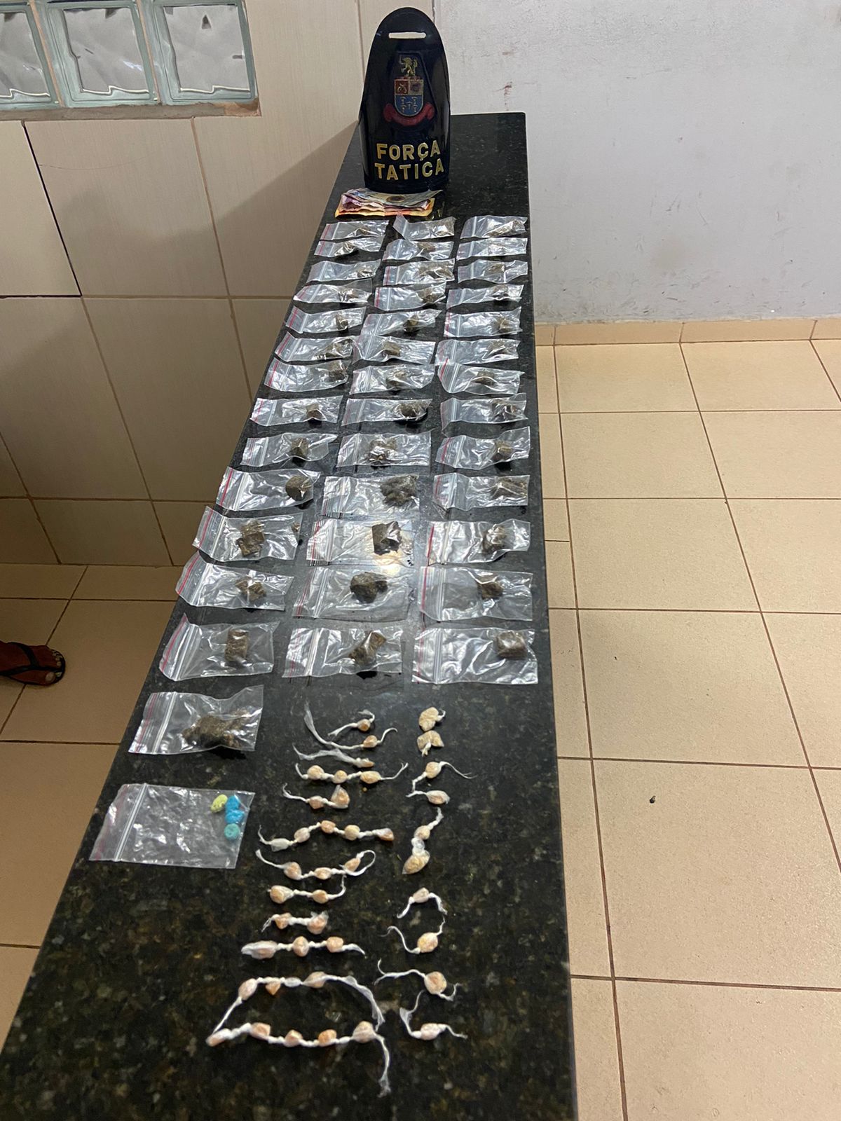 Cb Carlos e soldado Bruno, estavam em patrulhamento de Força Tática, pela rua citada, quando avistaram um indivíduo agachado mexendo em uma sacola plástica. Ele foi abordado e em seu poder foram localizados entorpecentes e dinheiro. O menor foi encaminhado para a Central de Polícia Judiciária e entregue para a família.