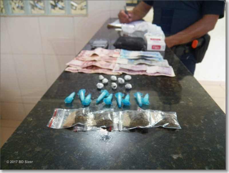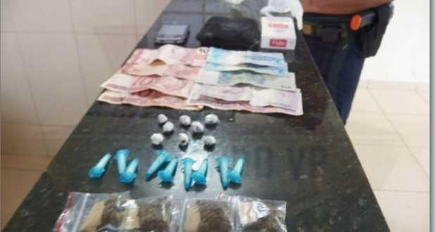 Segundo a GM, ele estava vendendo droga para um indivíduo de 31 anos. Ainda de acordo com a GM, com o adolescente foram localizados R$ 56,00, 8 pedras de crack, 4 porções de maconha e 9 pinos de cocaína. O menor foi conduzido ao Plantão Policial e entregue para a família.