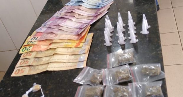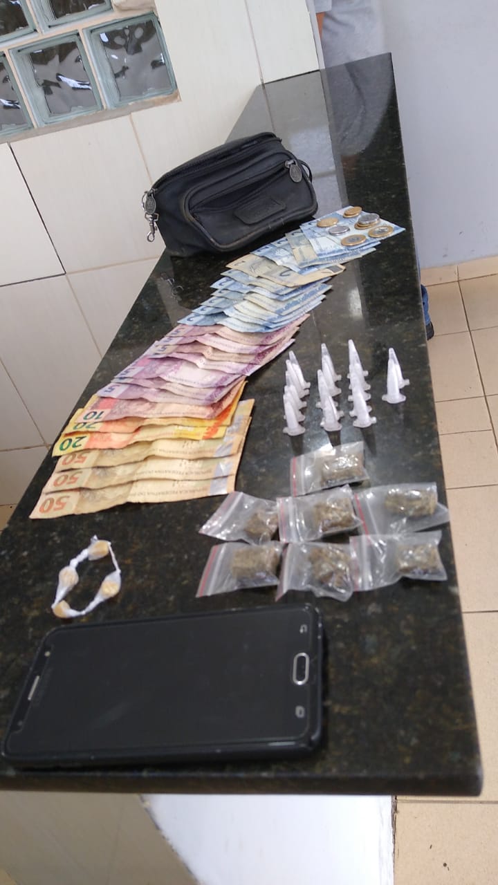 De acordo com os policiais da ocorrência, eles estavam em  patrulhamento prevento quando avistaram o adolescente mexendo em uma pochete. Este tentou fugir, mas foi abordado. Foram apreendidas 04  pedras de crack, 7 invólucros de  maconha, 17 pinos de cocaína e R$  265, 40.
