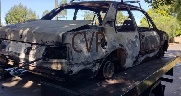 Um veículo Monza, o qual havia sido furtado, foi encontrado neste domingo, 21-05-2023, completamente carbonizado na região de Ibaté-SP.