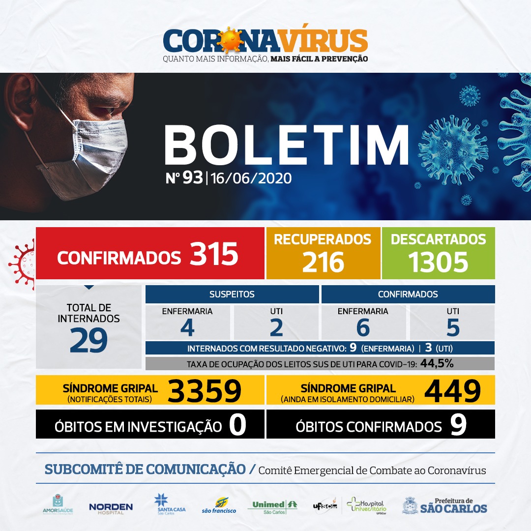 São Carlos contabiliza neste momento 315 casos positivos para a doença (5 resultados positivos foram liberados hoje), com 9 mortes confirmadas. 35 óbitos já foram descartados até o momento.
