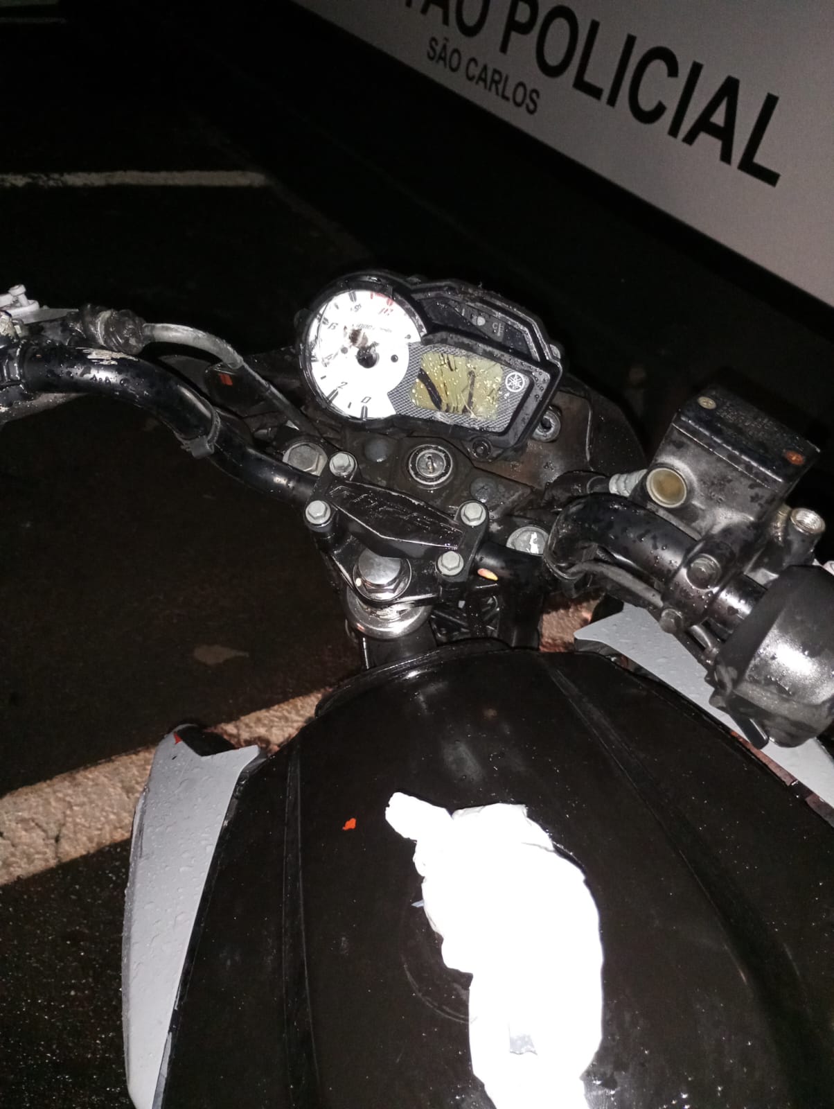 Uma moto furtada no dia 22-12-2023, foi localizada pela PM na noite do dia 03-01-2024, na Rua Guarino Baldan, bairro Antenor Garcia, São Carlos-SP.