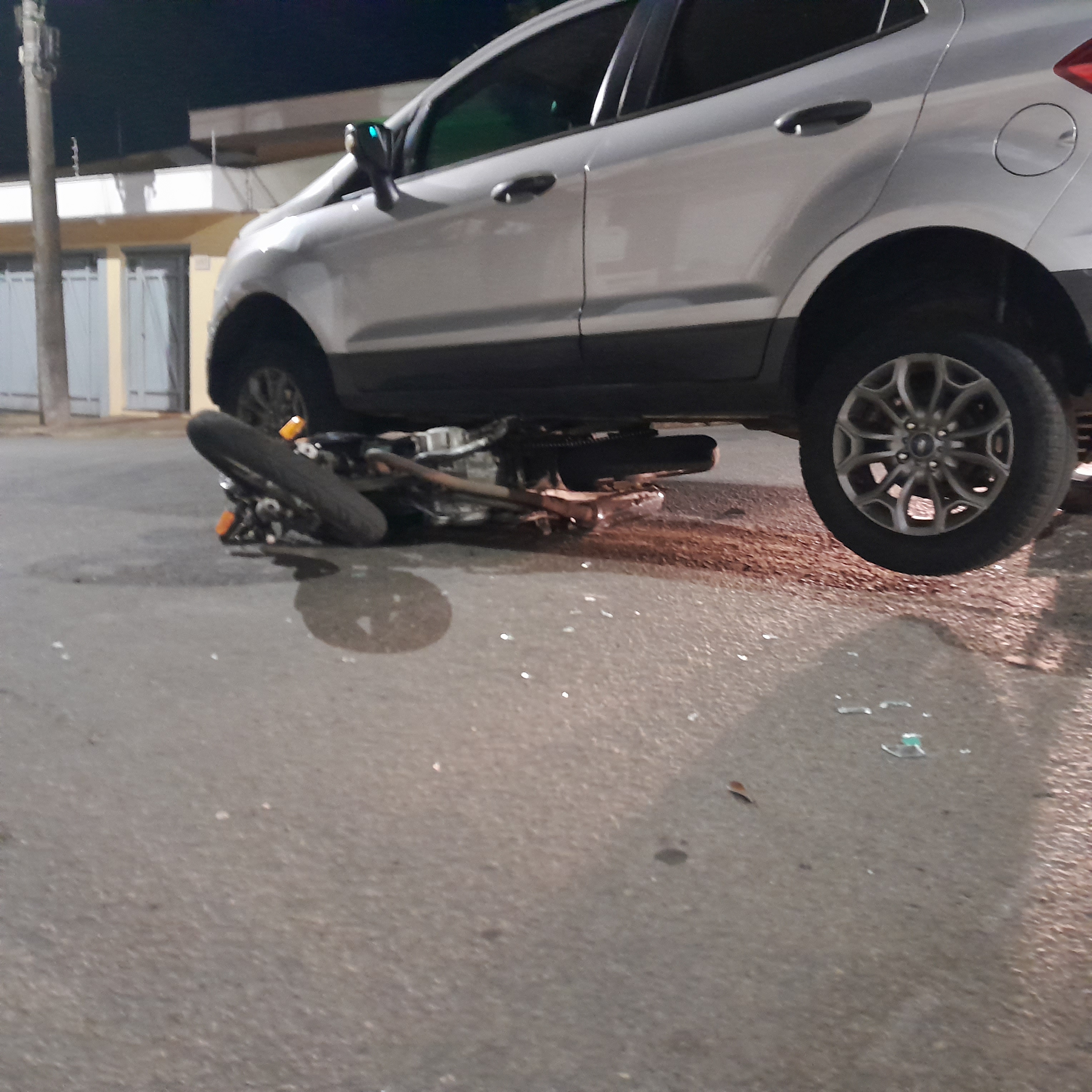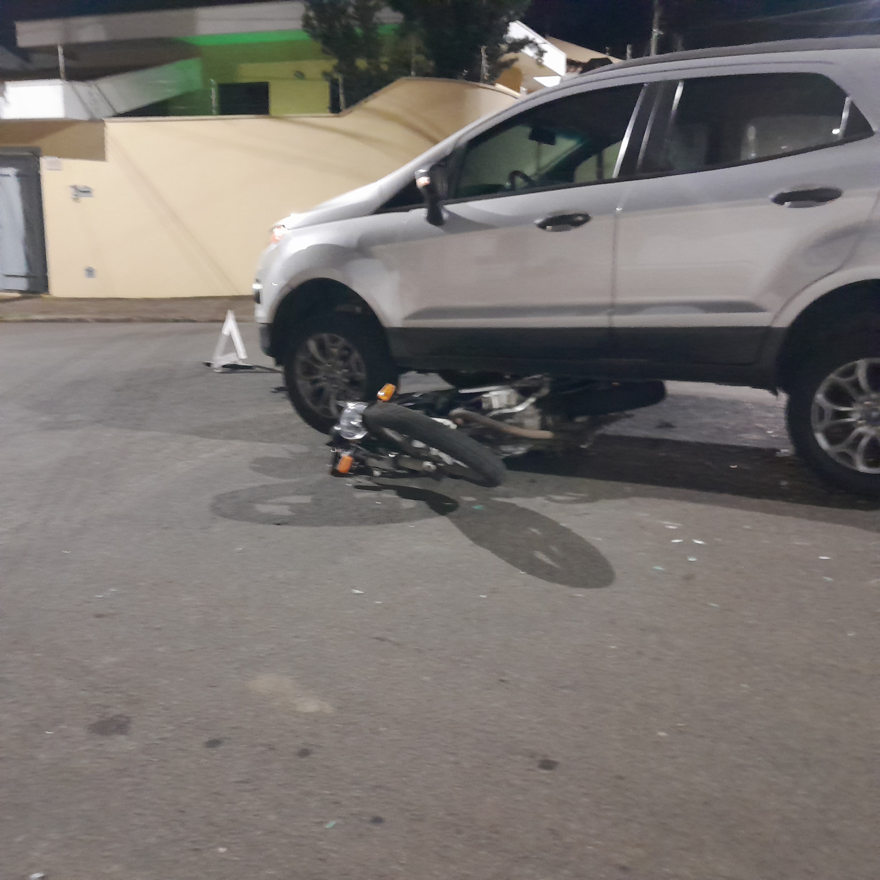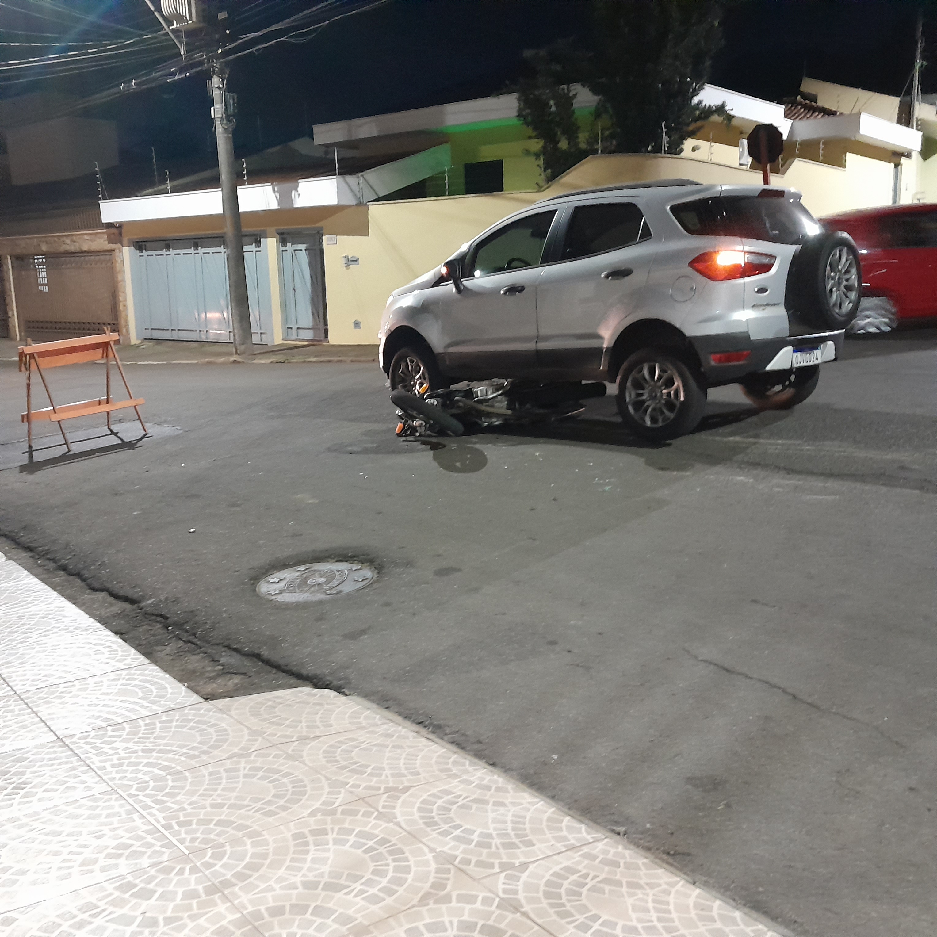 Uma moto parou debaixo de um carro nesta noite de sábado, 29/07/2023, na Rua Conde do Pinhal, cruzamento com a Rua Maria Isabel de Oliveira Botelho, bairro Vila Nery, São Carlos-SP.